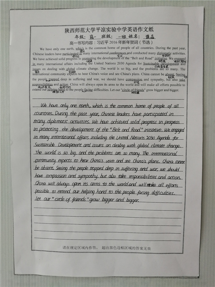 此次比赛要求学生在规定的时间内规范地进行英文书写,高一书写内容节选自习总书记2016年新年贺词,七年级书写内容节选自习总书记2017年新年贺词,让同学们跟着习总书记学英语,如“一带一路”、“世界那么大”、“朋友圈”、“上下同欲者胜”以及“撸起袖子加油干”等英文表述。同学们以极大的热情和认真的态度参与了这次书写活动,他们认真书写,充分展示自我。最后,经过英语老师们认真细致、公平公正的裁决,以年级为单位分别评选出了一、二、三等奖共计42名学生。