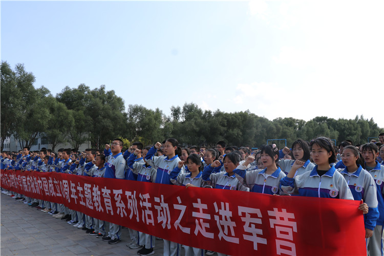 在中华人民共和国成立70周年之际,为了喜迎国庆,培养学生爱国主义情怀,增强国防意识。9月27日下午,由学校副校长李晓亚和德育处主任朱海、团委书记张彬、副主任李军及高一年级组长白杰,带领高一年级师生及全体宿舍管理人员前往武警机动第九支队驻地军营开展“走进军营”主题教育活动。校团委借此也成功开展了“我与祖国共奋进——国旗下演讲”主题团日活动。