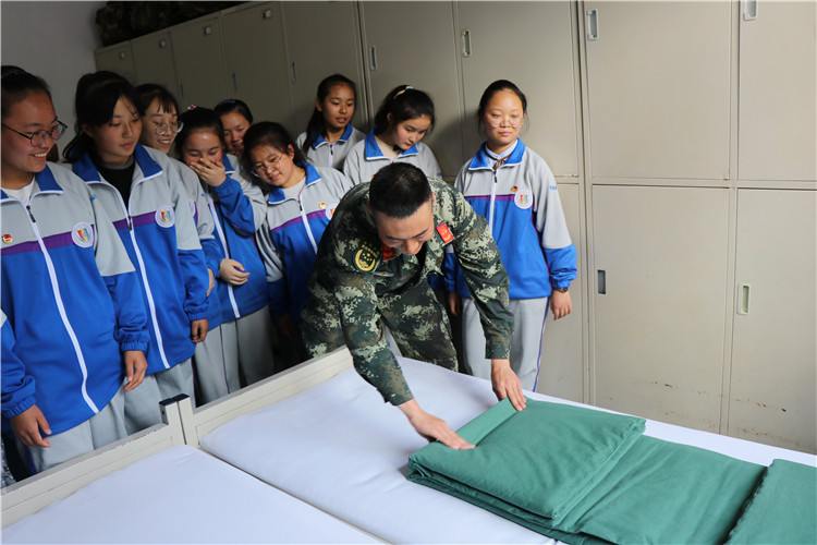 活动最后,全体师生在部队教官的带领下参观了师史馆。讲解员为大家现场讲述了该部队从建立到现在的光荣历程,每一个展板都带有历史的痕迹,每一张照片背后都蕴藏感人的故事。通过讲解,学生们感受到部队的辉煌战绩和光荣传统。面对一幅幅珍贵的画卷,一件件稀有的实物,同学们仿佛进入了那个硝烟弥漫、艰苦奋斗的革命岁月,感受到了今天幸福生活的来之不易。参观完师史馆之后教官带领学生们参观了官兵的宿舍内务,看着整洁明亮的房间和整齐划一的内务设置,同学们都赞叹不已。现场教官为大家亲切的展示了叠被子的步骤与方法,并邀请同学们亲自上手尝试。在教官的引导下,还观摩了部队的专业救援装备,包括防毒面具、救生衣、救生绳等。最后,教官带着学生到综合训练场集合,武警战士为大家展示了双杠、单杠训练动作。单杠360度旋转,双杠支撑倒立等一个个潇洒利落的动作,引来现场一阵阵掌声。
