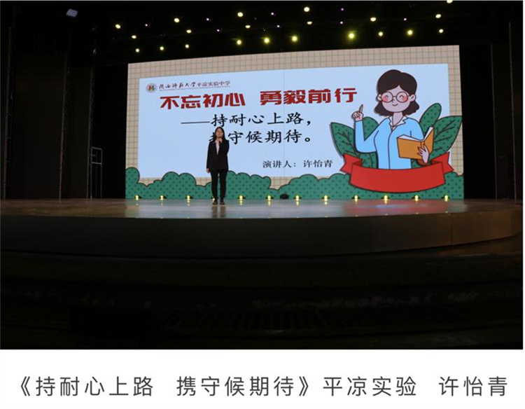 来自三所学校的8名教师紧紧围绕“不忘初心 勇毅前行”这一主题,以满腔的热情和动人的语言,或讲切身经历,或分享心得,绘声绘色、娓娓道来。演讲者的真情打动了在座的每一位听众,他们声情并茂地从不同角度诠释了对师德师风的见解和对教育事业的热爱,令聆听的教师为之动容。最终,我校张安辰、许怡青和孟雪婷老师均获得优异成绩。在高昂激越的音乐中,各位领导为获奖教师颁发了获奖证书和奖杯。比赛结束后,三校教师携手为大家献上了一场视听盛宴。其中我校教师带来四个节目,分别是朱斌老师演唱歌曲《等待》,何亚伟老师带来秦腔《龙凤呈祥》,张彬、戴瑶和路文婷老师合唱歌曲《父亲的草原母亲的河》,马菁、高存霞等15位老师表演舞蹈《万疆》。